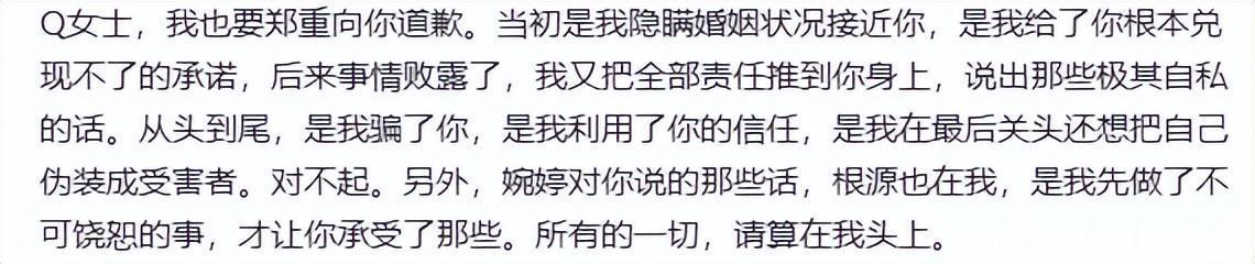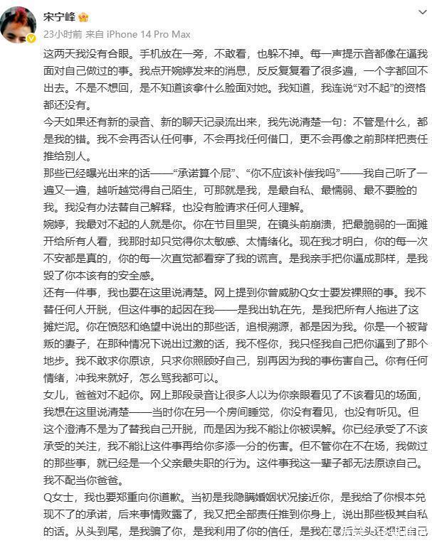 编辑|2号探秘人 4月1日,宋宁峰的一封道歉长文把热搜炸穿了。 不是那种“我正在反思”的公关套话,也不是“对不起大家我错了”的万金油模板。 他发了几千字,把自己的婚内出轨、撒谎、甩锅,一件一件掰开揉碎了往桌上摆。 甚至还专门向第三者Q女士道了歉。 这个操作,在娱乐圈出轨道歉史上,属实罕见。 但就在大家还没来得及消化这波“道歉文”的时候,24小时之内,另一条猛料又被扒了出来。 2022年,宋宁峰和妻子张婉婷一起上了婚姻纪实观察真人秀: 节目里,张婉婷的表现可以用四个字形容: 她屡屡打断宋宁峰的话,还在镜头前公然贬低他,甚至还自曝在争吵时曾掐住对方脖颈。 而宋宁峰呢? 沉默、隐忍、低头,像个做错事的孩子一样不敢吭声。 观众看的血压飙升,开始对她口诛笔伐。 当时还有个热搜: 阅读量好几个亿。 网友一边倒地劝离。 可惜节目结束后,两人没离婚。 反而还在去年年底,生了第二个孩子。 很多人都以为,这俩人大概是磨合好了,日子能过下去了。 谁也没想到,今年3月,平地一声雷: 爆料人不是别人,正是出轨对象Q女士本人。 她甩出了录音和聊天记录,锤得死死的。 录音里,宋先生说了一堆真实但不算人的话: 和他之前在节目里那个“被欺负的老实人”形象,简直判若两人。 一时间,舆论彻底反转。 那个全网同情的好男人,原来是个骗婚又骗感情的“时间管理大师”。 眼看舆论到了不可控的地步,他出面了。 他不玩虚的,直接承认: 给妻子道歉,给女儿道歉,给公众道歉。 但最让人意想不到的,还是给第三者到道歉。 这句话,放在娱乐圈的出轨道歉史上,太少见了。 但就在大家以为事情到这里该收尾的时候,新的猛料来了。 有网友扒出了更早之前的情感线。 原来,宋宁峰自己开户配资平台,当年也是“被出轨”的那一个。 2000年,周迅和宋宁峰走到了一起。 那时候的她已经是当红女星,而他还是个模特,偶尔拍拍戏。 门不当户不对。 但这段感情,还是维持了两年。 听起来时间不算短。 但玩味的是,在周迅的感情履历里,他的名字往往被一笔带过。 被形容成: 为什么是“空白”? 因为就在那段时间,周迅的另一段感情正在暗流涌动。 2001年,周迅接拍了作品: 拍戏过程中,和李亚鹏因戏生情。 两人在片场毫不避讳地暧昧。 李亚鹏当时的正牌女友瞿颖来探班,看到这一幕,哭着就走了。 后来李亚鹏和瞿颖分手,和周迅走到了一起。 但问题是,当时周迅还没和宋宁峰分手。 换句话说,周女士和李先生在一起的时候,周迅有男朋友,李亚鹏有女朋友。 这段往事因为时间太久,加上后来周迅名气太大,很少有人再提宋宁峰的名字。 但宋宁峰自己可没忘。 2005年,他接受杂志采访时,罕见地谈起了这段感情。 他说李亚鹏曾经找过他谈话。 没有细说具体内容,但字里行间能感受到,那段分手对他来说不是一件轻松的事。 他还说,以后会排斥和周迅合作,因为见面会尴尬。 当然,后来他们还是合作了。 2008年、2015年,两人又有了交集。 但那都是后话了。 说回宋宁峰。 经历了和周迅的这段感情之后,他的性格是不是发生了变化? 我们不得而知。 但有一点可以确定,他在感情里的安全感,可能从那以后就开始打折了。 2012年,他和演员齐溪结婚。 这段婚姻维持了七年,2019年离婚。 知情人士透露,离婚原因: 但两人分开的速度很快,而且离婚后各自迅速有了新欢。 齐溪和王传君在一起了。 宋宁峰则和张婉婷相识一个月就奉子成婚。 再然后,就是我们在节目里看到的那个画面。 一个沉默隐忍的丈夫,和一个歇斯底里的妻子。 很多人说,宋先生在节目里看起来太压抑了,压抑到让人怀疑他会不会出轨。 果然,预言成真了。 20年前他被背叛,20年后他自己成了背叛者。 可奇怪的是,当他选择坦荡承认的时候,风向反而变了。 为什么? 因为和圈里那些“打死不认”的男明星一比,他至少还像个男人。 承认错误,不是一种值得表扬的美德。 但说实话,宋宁峰的道歉在内娱,的确算得上“体面”。 高亚麟,演了二十年“国民爸爸”夏东海。 荧幕上温文尔雅、尊重女性、是“丁克好男人”的典范。 结果被曝婚内出轨,还在女方怀孕期间动手打人。 最离谱的是,他一边维持丁克人设,一边偷偷和别的女人生了孩子。 事情曝光后,他装聋作哑,连个屁都没放。 2025年,法院强制执行他310万债务,788万股权被冻结。 曾经的“国民老爸”,一夜之间变成了失信被执行人。 王迅,在真人秀里靠“老实人”人设圈粉无数。 结果没多久被扒出婚内出轨,和原配离婚后没多久就娶了第三者。 还在小号上秀恩爱: 前妻和他相守十几年,连个孩子都没留下,最后一个人抗癌四年,去世时王迅连句悼念都没有。 据说那时候他正忙着和第二任妻子闹分居、被曝“再次出轨。” 陈翔,2017年被毛晓彤抓包和江铠同共处一室。 当时电梯监控曝光,画面里江铠同鬼鬼祟祟溜走,毛晓彤连夜搬家。 陈翔打死不认,发了N篇声明说: 四年后,毛晓彤放出两段录音,把陈翔锤得死死的。 2014年,文章和姚笛被拍到挽手同游。 文章的道歉声明写得很“文绉绉”: 他辜负了马伊琍,辜负了孩子,辜负了家庭,辜负了所有对他寄予期望的人。 但全文没有提到姚笛一个字。 姚笛从此被贴上“小三”的标签,事业一落千丈。 而他呢? 道歉之后回归家庭,继续拍戏,直到多年后才和马伊琍离婚。 至于姚笛,他欠她的那句抱歉,永远没等来。 