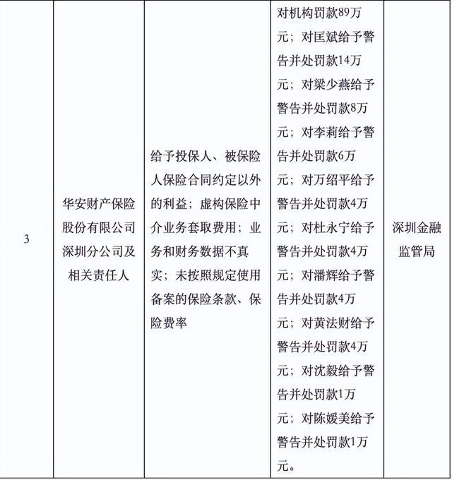 4月24日,深圳金融监管局发布行政处罚信息公示表,对华安财产保险股份有限公司深圳分公司(以下简称“华安财险深圳分公司”)及相关责任人作出行政处罚决定。根据公示表显示,华安财险深圳分公司因存在给予投保人、被保险人保险合同约定以外的利益,虚构保险中介业务套取费用,业务和财务数据不真实,以及未按照规定使用备案的保险条款、保险费率等四项违法违规行为,被处以罚款89万元。
